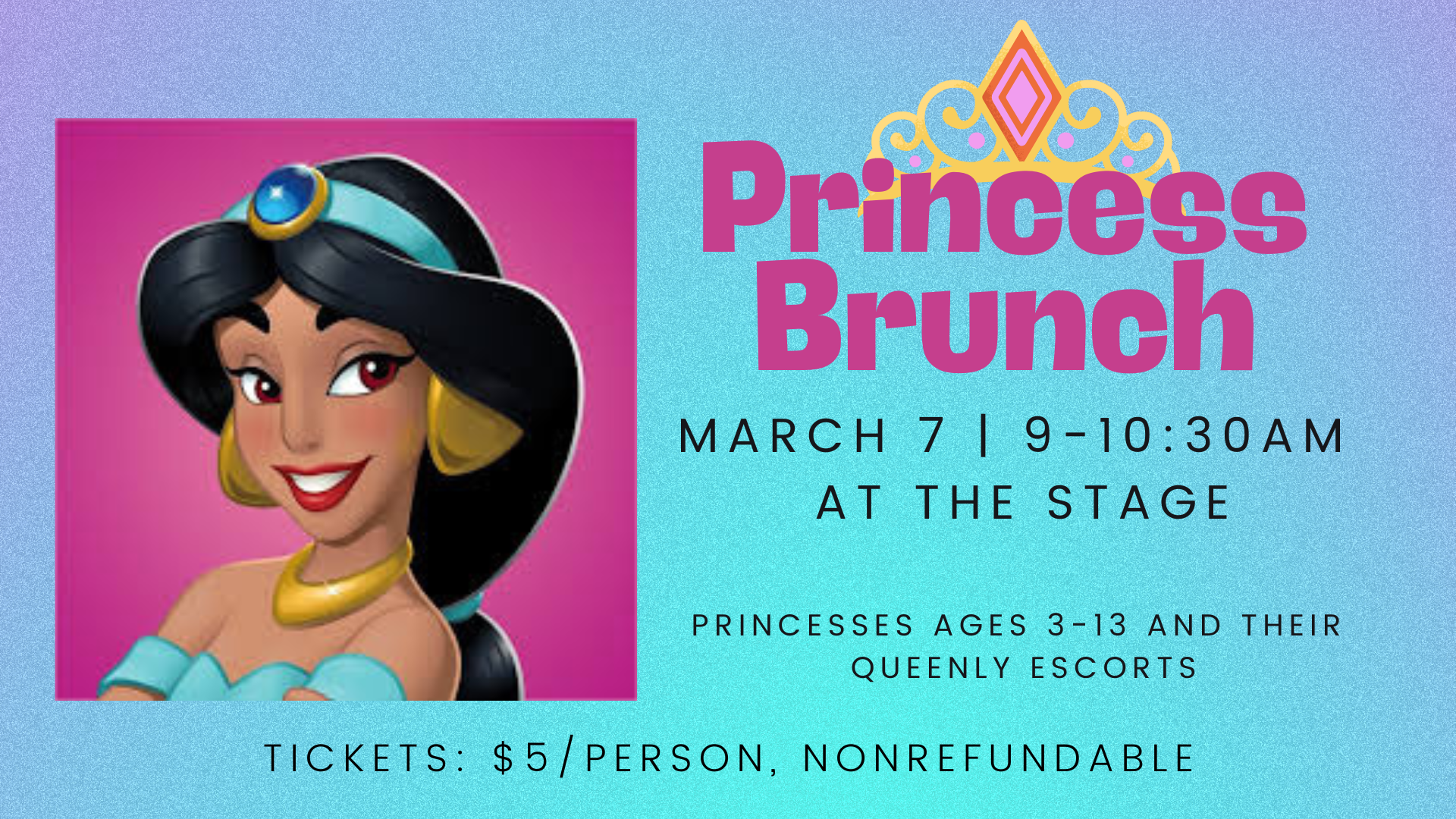 Princesses ages 3-13 and queenly escorts, please join us for a Princess Brunch on Saturday, March 7 from 9-10:30am. Tickets are $5/person and are nonrefundable.